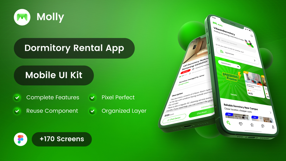 Molly has over +170 Premium UI Kits designed specifically for dorm rental applications. So this application is basically for people who are looking for dormitory rentals because this application is practical for people who are migrating or studying in far away places.